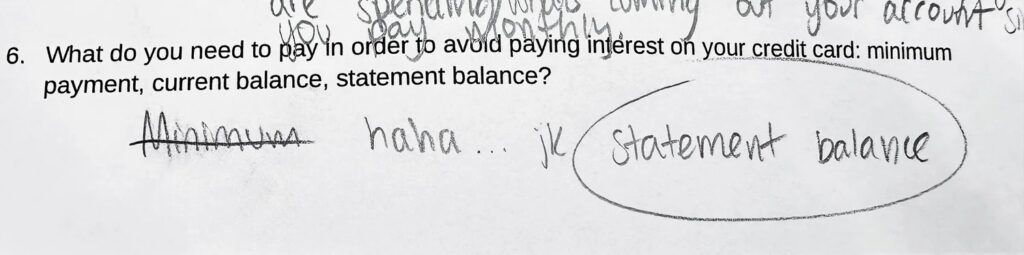“This class definitely had a big impact on my life. It made me think about money and my future in such a different way. I was able to think deeply about what I want for my life, and figure out the ways to make those things happen. It also gave me so much valuable information that I will be able to use for my whole life.